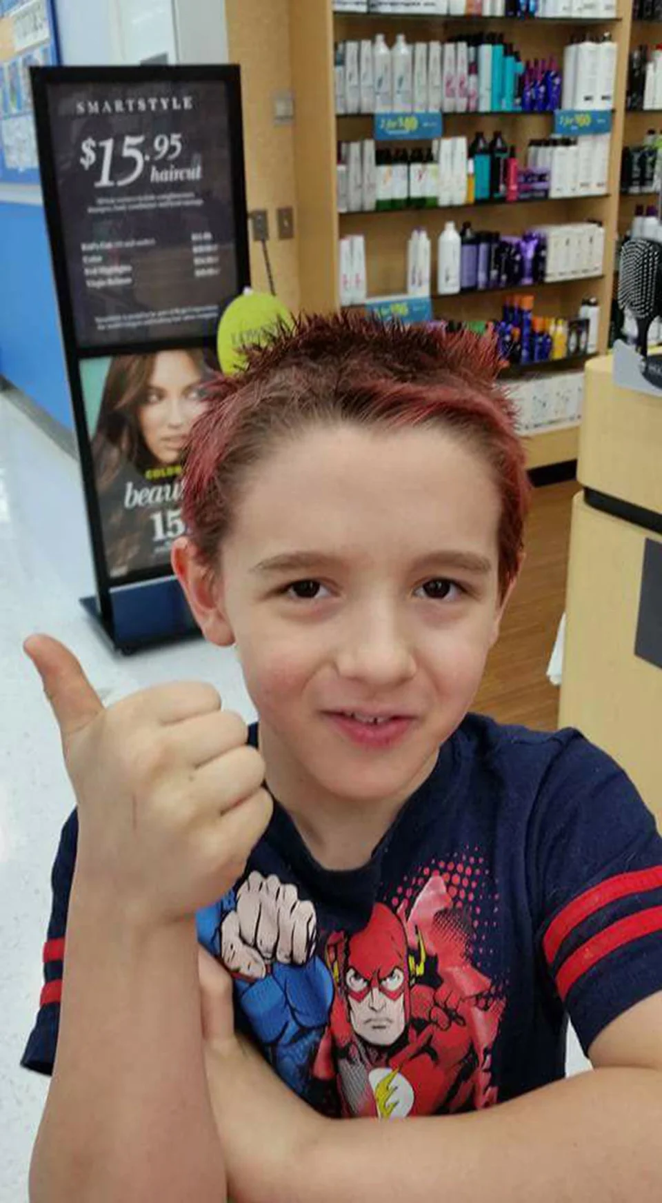"Autism in our house is constant conversations about Minecraft and Skylanders. We are pretty proud of this photo. It was six years in the making. His last.hair cut at a salon was when he was 3 years old. He would go into meltdowns from the sensory overload of a haircut. In February 2017, he kept asking to dye his hair red, so we went back. He got a haircut and dye. He was so proud and so were we! He's 9 now, almost 10 and every day has its challenges, but every day I also see him persevere through uncomfortable sensory or social situations. He's come so far and we are beside him every step of the way!"