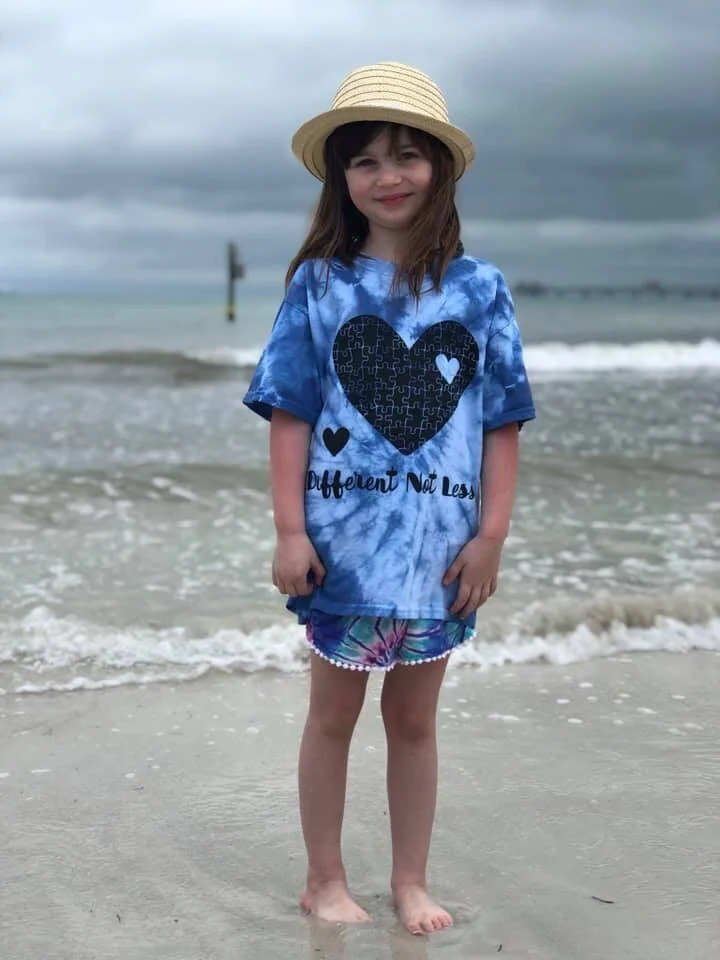 "Zoe was diagnosed with autism at 23 months old. We had known for a long time prior to the testing that she had autism, but who was to say she wasn't just different than the rest. Every day is unpredictable. Zoe never has a boring day. I remember waiting YEARS to hear her first word. When she said it, I pulled the car over and cried so hard. She flapped her arms and did her self-stimming tongue thrusting, and I joined in too! She is just like every other child. She has good days and bad days. She has milestones and regressions. It's just that autism gives her that extra push to do things on a larger scale. I think she has started to learn that she is different than her classmates, and she has already been the target of bullying. Autism prevents her from understanding that bullies are trying to hurt her. She still will walk up to them and slowly make eye contact, smile, stick her hand out, say 'Hi friend! I'm Zoe Grace!', lick their cheek and skip away. #DifferentNotLess"